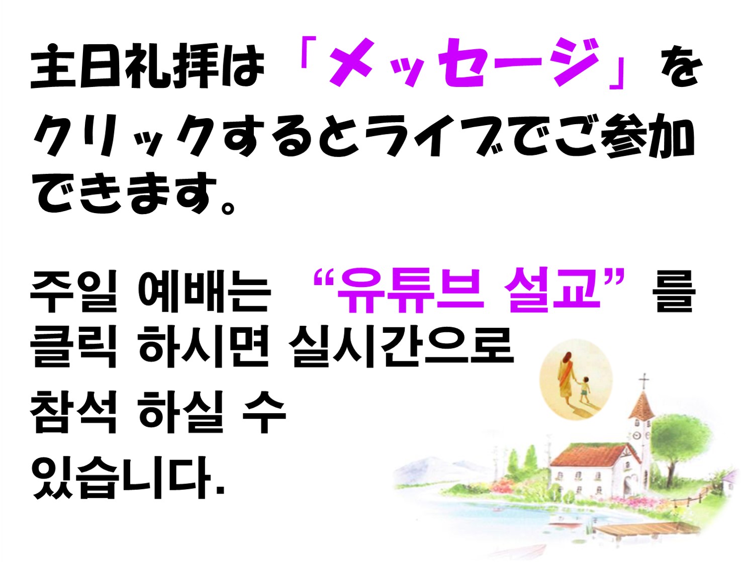 성령의 감동과 은혜가 충만한 예배, 뜨거운 찬양과 기도, 풍성한 교제와 비전이 있는 교회로 여러분을 초대합니다.